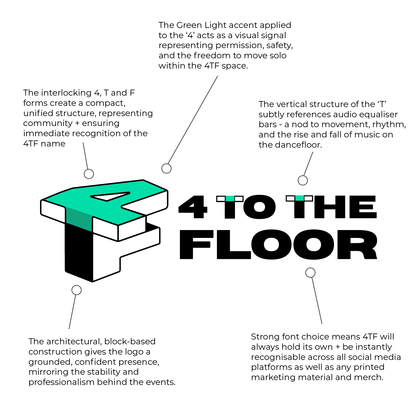 The 4TF identity was designed with real-world strategy in mind. The green colour palette acts as a recognisable signal for safety, space and permission, while anchoring brand recognition directly to the 4 within the logo. This makes 4TF instantly identifiable across socials, signage and in-person events, allowing attendees to easily locate staff or organisers in busy, low-light environments. By avoiding overused neon palettes common in the techno scene, the brand cuts through visually while remaining confident, intentional and community-focused.